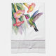 A vibrant watercolor illustration featuring a colorful hummingbird gracefully sipping nectar from soft pink and coral trumpet flowers. This elegant design showcases delicate floral details paired with iridescent feathers in shades of green, purple, blue, and gold, creating a whimsical and nature-inspired aesthetic. Perfect for spring designs, garden lovers, bird enthusiasts, and feminine artistic projects, this artwork adds a fresh, airy, and enchanting touch to any product or occasion.