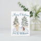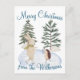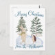 This custom Christmas or holiday postcard features a warm and cozy, snowy winter watercolor scene. Two cute little forest animals, a hedgehog and bunny, are ice skating among the trees.