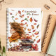 Notebook featuring an inspirational message of Knowledge is Power in the upper left corner with a watercolor illustration of a girl with wind swept hair and a stack of books among blowing swirling leaves in muted fall color tones. In the background is a watercolor brush stoke in neutral tones to match illustrations. A notebook with an encouraging message for students starting a new school year. Additional styles and paper designs available. Illustration may need to be adjusted for varying sizes.