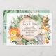 Whimsical thank you card featuring illustration of rustic watercolor greens, foliages and adorable jungle animals: lion, elephant, giraffe, monkey and hippo