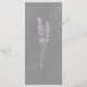 Wedding menu featuring purple lavender watercolor flowers and watercolor spatter on a gray background.