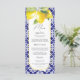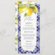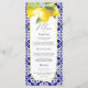 Modern citrus theme wedding dinner reception menu features lemon blossoms and blue Mediterranean tile pattern. All text, fonts, and colors can be changed. Coordinating items available to complete your wedding suite.
