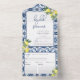 It's a bridal shower! This convenient bridal shower invitation has a detachable recipe card at the bottom for guests to fill out and bring with them. It eliminates the need for additional enclosure cards. The theme is an Italian Lemon Positano with blue tile and watercolor lemon floral bouquets.