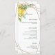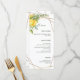 A fresh and cheerful botanical floral wedding menu featuring watercolor lemons and eucalyptus leaves. Perfect for summer weddings and bright table settings. Personalize with your menu items for a lively reception detail.