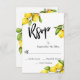 This card features a typography graphic reading "RSVP" and "M" that was rendered in a handwritten, casual script font. Displayed around the borders I've placed an array of watercolor lemon clusters with greenery attached. All editable text appears in a versatile serif typeface that can be changed if you wish. More lemons were placed on the back of the card. All layers were added separately so you can have maximum design control. Rotate or re-position any part of the design you see fit to edit. Don't hesitate to reach out if you have special requests with which I can assist. // 105 //