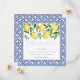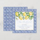 Watercolor lemons and delicate blossoms are complemented by a cobalt blue and white tile border and pattern reverse on these Save The Date cards.