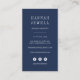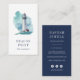 Elegant vertical business cards for your coastal based business feature a watercolor lighthouse illustration in nautical blues and greens, with your name and/or business name beneath. Personalize the reverse side with your contact information, including three social media icons and a template field for your social media username, in white on navy blue.