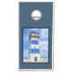 Nautical themed design with watercolor lighthouse decoration in dark blue frame. It is possible to change the background color and to add different one to the design with your choice.