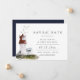 Elegant watercolor lighthouse, Save the Date Card. Elegant and modern typography design. Backing color, shown in navy blue, can be customized.