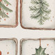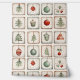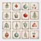 Cute watercolor line art, little squares filled with simple doodly xmas, ornaments and decorations, in christmas colors. Cartoon elements in different variants, stockings and bubble ornaments, Christmas wreaths in soft colors
