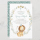 Invite family and friends to your baptism event with this customizable invitation. It features watercolor illustrations of a cute baby lion price and a foliage wreath with a matching pattern. Personalize by adding name, date, time, venue and other event details. This lion baptism invitation is perfect for baby boy baptisms.