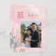 This modern Chinese wedding thank you card features a custom photo, a dusty pink double happiness symbol, and a watercolor painted lotus flower on a pink watercolor background and an elegant handwritten script.