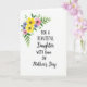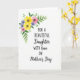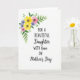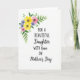 This card features a bright floral cluster in the upper left, painted in a soft watercolor style with yellow, pink, and purplish-blue blossoms nestled among fresh green leaves. The open white background gives the flowers room to breathe, like a quiet moment shared between loved ones ❤️. Centered on the page, the message is laid out in stacked lines, mixing a simple, modern print style with a flowing cursive look for a tender, affectionate tone. “FOR A BEAUTIFUL Daughter” appears prominently in darker lettering, while “WITH love” is set in a more graceful cursive style that feels like a gentle note. “ON Mother’s Day” sits below in smaller text, keeping the focus on the main words without crowding the design. The overall layout feels calm and caring, with the airy space and soft petals suggesting closeness and appreciation 🌼. The flowers show light yellow blooms, blush pink petals, and small purplish-blue accents, with thin leafy sprigs reaching inward from the top-left corner.