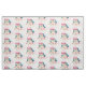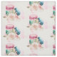 Fabric with a delightful image. 3 colorful macarons, pink, green and blue with a fancy rose floral bouquet and a splash of pink watercolor behind. Delicious and stylish too! White Background.