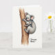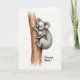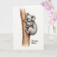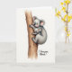 Designed with two soft grey, tree-dwelling marsupials at the center, the image shows an adult gently hugging a smaller youngster as they cling close together. A textured tree trunk runs vertically along the left side, giving them something sturdy to hold while their bodies lean in with a tender, trusting closeness ❤️. The background is plain white, keeping the focus on their fluffy fur and the quiet, affectionate moment between them. Both have rounded dark noses, glossy dark eyes, and large fuzzy ears with pale pink inner details, plus a light rosy blush on their cheeks that adds warmth. The adult’s arm wraps around the smaller one in a protective pose, while the youngster nestles in, gripping the bark as if reluctant to let go. In the lower right, the message “I love you, Mama!” appears in flowing dark lettering, balanced against the tree on the opposite side 🌼. Soft grey washes shape the fur, while the trunk is painted in earthy browns with subtle bark marks and shaded grooves. The tree’s bark shows small organic lines and speckles, with darker shading along its right edge where it meets the white space.