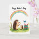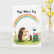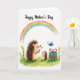 The front design shows a soft watercolor-style scene where two spiky-backed forest creatures share a sweet moment on a green meadow ❤️. A larger creature with textured quills leans forward, offering a yellow daisy to a smaller, wide-eyed companion whose face tilts up with an affectionate, trusting look. Around them, blades of grass sway among scattered orange wildflowers and a few slender leafy sprigs, adding a gentle, outdoorsy setting. Near the top of the card, a short celebratory message sits at the apex in a dark, handwritten-style line of text, standing out against the white space. A softly arcing rainbow stretches across the upper area in blended pastel tones, giving the scene a calm, friendly glow 🌼. Off to the right, a teal gift box rests on the meadow, wrapped with a deep red ribbon tied into a neat bow. A small turquoise butterfly hovers nearby, its wings lightly detailed as it floats above the grass. The white background stays open and airy, making the rainbow, gift box, and meadow colors easy to spot.