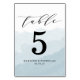 Elegant wedding table cards featuring a blue watercolor wash background with a hand lettered calligraphy font. Personalize the stylish table number cards with your name and wedding date for a custom look.