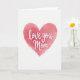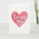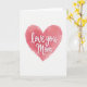 This card features a large heart in soft salmon-pink watercolor tones centered on a white background, with gently uneven edges that feel tender and intimate ❤️. Inside the heart, the words “love you Mom” sit across the middle in smooth, flowing white lettering that looks like it was brushed on with care. The text is sized to fill the heart without crowding it, giving the message room to breathe while staying close and affectionate. Lighter blush washes mingle with deeper coral patches, like a warm blush rising in a loving moment between parent and child. Subtle speckles and pooled pigment add texture, suggesting quiet devotion rather than anything overly polished. The white lettering contrasts softly against the pink, so it’s easy to read while still feeling gentle. A calm, open border of white space surrounds the heart, keeping the focus on the closeness at the center 🌼. The heart’s watercolor shading shifts from pale pink near the top to richer coral tones toward the lower curves.