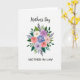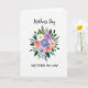 This greeting card features a tall, vertical layout with a round watercolor bouquet centered on a bright white background. The flowers blend coral pinks, gentle lavenders, deep violet, creamy whites, and periwinkle blue, with translucent petals that feel soft and affectionate ❤️. Layers of leafy greens—some light and springy, others deeper and shaded—wrap around the blossoms like a supportive embrace, adding depth and a quiet closeness. Above the bouquet, the words “Mother’s Day” sit near the top in a flowing, elegant letter style, colored in a matching soft tone that doesn’t overpower the art. Below the bouquet, “MOTHER-IN-LAW” is placed near the bottom in uppercase, using a simple, modern font in a darker shade for clear readability. The open white space around everything keeps the focus on the bouquet and gives the design a calm, respectful warmth, like a gentle smile shared between family members 🌼. Fine brush textures and smooth color fades are visible in the petals and leaves, and the circular arrangement looks full and neatly balanced at the center.