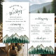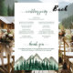 These wedding programs are elegant and tasteful, while still being budget friendly. The design features a rustic watercolor pine tree forest with mountain peaks in the background. The typography features lacy forest green script calligraphy, and there is room for details on the ceremony, the bridal party, and a short thank you.