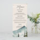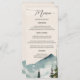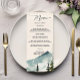 This wedding menu showcases a beautiful watercolor rendering of mountain peaks and verdant pine trees. The cool hues of blues, greens, and earthy browns instantly transport your guests to a serene mountainscape.