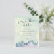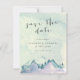 A modern wedding save the date perfect for your mountain side wedding. This design features watercolor mountains and trees in blue and purple on a watercolor wash background. "Save the date" is in charcoal modern calligraphic font.