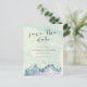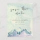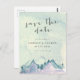 A modern wedding save the date postcard perfect for your mountain side wedding. This design features "Save the date" in charcoal modern calligraphic font, with watercolor mountains and trees in blue and purple on a watercolor wash background.