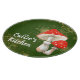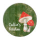 Add a little whimsy to your kitchen with this nature-themed design that features a red and white spotted mushrooms watercolor illustration on dark green background with a gold splatter overlay and customizable text in white script font.