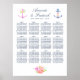 Trendy navy and white nautical theme wedding seating chart poster featuring watercolor floral pink and blue anchors and flowers.