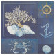 12 inch repeat. This design is perfect for a nautical, seaside decor for a weekend retreat, shore beach cottage at the ocean. It is a bold and graphic, yet warm and elegant designer home decor fabric. If your style is seashore inspired, whether you live at the sea or simply wish you did, it will lift your spirits! In khaki tan, Indigo blue, navy, royal, ocean blue hand painted, highly textured, watercolor background squares and rectangle frames that have been touched with rich brown accents. This pattern is made from a hand painted nautilus, conch, fan coral, turban shells and a scallop seashell with a blue crab, ship's wheel and an anchor. A Very loose, hand painted modern painterly style that is perfect for a waterside retreat. Original artwork copyright Audrey Jeanne Roberts.