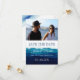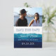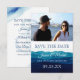 Modern and fun Save the Date with watercolor waves and washes, with beautiful shades of navy, deep blue, light blue. The artwork resembles ocean waves or mountains. Elegant typography. Cute light blue watercolor stains on the back side.