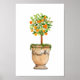 Art poster featuring a hand painted watercolor orange tree topiary in an antique stone urn.
