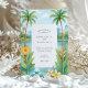 Set the scene for your tropical destination wedding with this watercolor Orlando invitation featuring lush palm trees, vibrant florals, and serene water views.