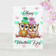 Happy Valentine's Day card. Cute watercolor owls sitting on a branch cuddling together on a cold snowy day. Romantic and cut way to say Happy Valentine's Day and I Love You. Teal and pink hearts.