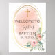 Beautiful watercolor pink/ peach and gold girl Baptism/ Christening Welcome sign. Design featuring watercolor background and oval geometric frame. Click customize further to edit /modify this template.