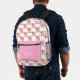 A delightful personalized backpack design featuring pink vanilla cupcakes topped with chocolate chip cookies, surrounded by chocolate candies and colorful accents.
