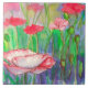 A pretty floral ceramic tile with blooming poppy flowers in soft pink and bright red with a indigo purple background sketched with sepia ink and painted with watercolor.