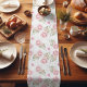Table runner featuring a seamless floral pattern with soft, watercolor-style illustrations of pink roses and buds. The flowers are accompanied by delicate green leaves and smaller blossoms, all arranged on a white background. The composition has a romantic and elegant aesthetic, with subtle golden specks scattered throughout for added detail. Suitable for a seasonal or casual table setting.