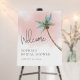Celebrate the bride-to-be with this beach themed bridal shower welcome sign featuring a watercolor illustration of a palm tree and pink sky.