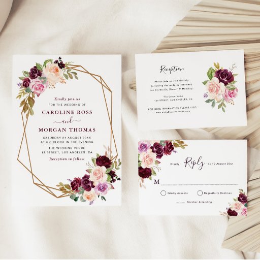 A wonderful floral wedding theme design with lovely plum purple and peach watercolor flowers. The color and text can be personalized.