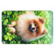 Flexible magnet featuring an adorable orange Pomeranian dog laying a field of clover with a few shamrocks. A cute St. Patrick's Day gift for Pomeranian owners and pom lovers.