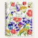 Personalized name and text large spiral notebook with bright and happy watercolor painted illustrations of butterflies, ladybugs, and field flowers: lavenders, pansies, poppies, and more.