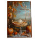 Thanksgiving holiday giftbag featuring a watercolor illustration of an autumn or Thanksgiving day dessert - a delicious pumpkin pie set on a ornate silver cake stand placed on a table with serving utensil, orange pumpkins, acorns, grapes and falling leaves. Happy Thanksgiving text and illustration appear on front and back of bag.