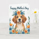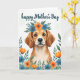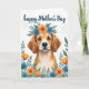 This greeting card features a sweet, expressive dog centered in the design, drawn with soft, watercolor-like shading that gives it a gentle, affectionate look ❤️. The dog has warm tan coloring and long ears that frame its face, and it gazes forward with wide, curious eyes that feel like a tender hello. A flower crown sits across its head, mixing bright orange blooms with small blue flowers and leafy green sprigs, like a little celebration tucked into the portrait. More flowers and foliage rise from the lower corners, curling inward as if they’re offering the dog a friendly, caring hug. The background stays plain white, keeping the focus on the dog and the floral colors. Near the top, the words “happy Mother’s Day” appear in a flowing, dark-toned cursive style, spaced neatly above the illustration 🌼. The orange petals and blue blossoms are the strongest color accents, with green leaves filling in the wreath and lower border.