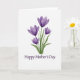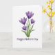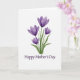 This card features a gentle digital illustration of four purple spring flowers, like early crocuses or small tulips, arranged as a small bouquet ❤️. Each bloom opens with soft, slightly translucent petals shaded from pale lavender to deeper violet, giving the flowers a tender, cared-for look. Slender green stems and long leaves gather closely at the base, as if held together in a quiet, affectionate gesture. The background stays bright white, keeping the focus on the blossoms and their calm, intimate presence. Centered beneath the bouquet, the text reads “Happy Mother’s Day” in a deep purple serif font that matches the petals. The lettering sits low on the front with generous space around it, making the message easy to spot without crowding the artwork 🌼. Subtle color shifts within each petal add depth, with darker plum tones near the centers and lighter edges toward the tips. The bouquet sits centered on the page, with the stems tapering downward and the four blossoms fanning slightly upward.