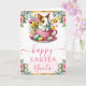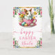 This charming Easter design features an adorable baby bunny sitting inside a pink teacup, surrounded by colorful Easter eggs, blooming spring flowers, and delicate butterflies. Soft watercolor textures, gentle pastels, and elegant floral framing create a joyful, heartwarming mood. The flowing script typography and balanced layout give the artwork a timeless, storybook feel—perfect for sharing Easter wishes with warmth, sweetness, and springtime cheer.