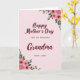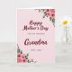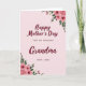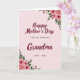 This card features a soft pale pink background that feels gentle and welcoming, with a quiet, affectionate tone ❤️. Watercolor-style floral clusters decorate the upper right and lower left corners, creating a diagonal flow that guides your eye across the design. The flowers include full pink roses in slightly varied shades, leafy green sprigs for contrast, and a few small white daisy-like blooms tucked between rosebuds 🌼. Centered in the open space, the main line reads “Happy Mother’s Day” in dark red, flowing lettering that looks graceful and caring. Just beneath it, “FOR AN AMAZING” appears in smaller, simple dark red text, like a calm pause before the next line. The word “Grandma” is larger and sweeping in the same flowing dark red style, giving it extra emphasis without feeling loud. Near the bottom, “WITH LOVE” sits in small, simple dark red letters, leaving plenty of soft pink space around it. The roses show layered petals with gentle shading, and the green leaves have light, brushy edges.