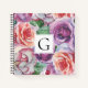 Watercolor roses and monogram floral spiral notebook. It showcases a pattern of vintage roses in purple and coral and your monogram in a white frame.