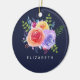 Personalized ornament with a nice bouquet of watercolor roses with sprigs, leaves and branches all together in a colorful floral arrangement. Navy blue background.