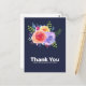 A party thank you postcard with a nice bouquet of watercolor roses with sprigs, leaves and branches all together in a colorful floral arrangement. Navy blue background. Personalized message on the back.